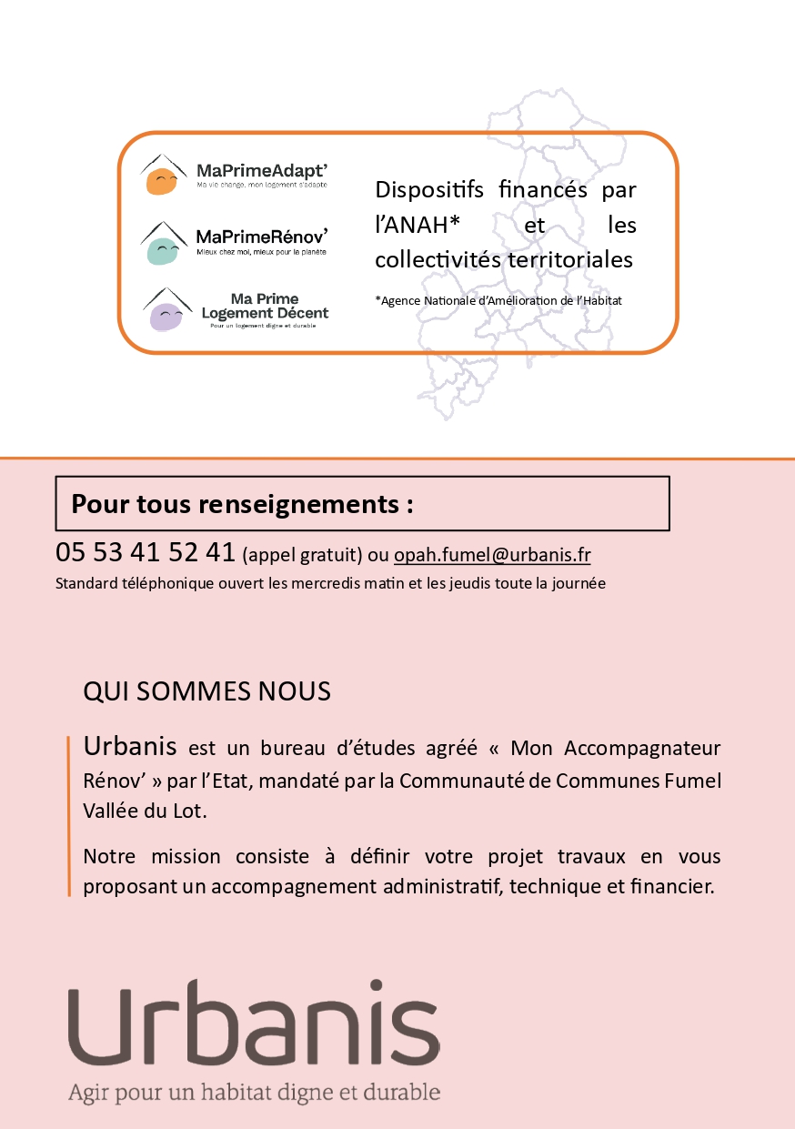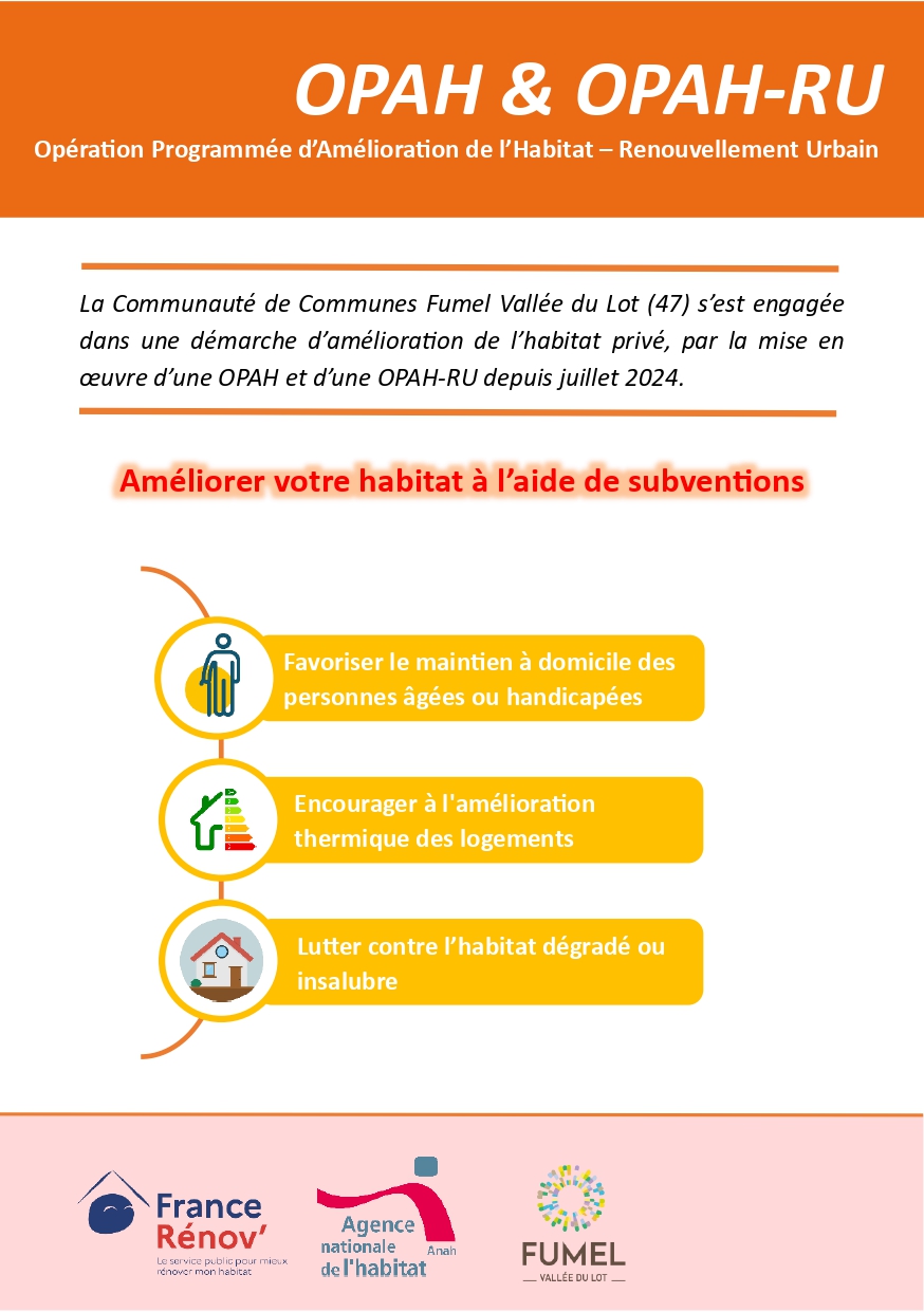 La Communauté de Communes Fumel Vallée du Lot s’est engagée dans une démarche d’amélioration de l’habitat privé, par la mise en œuvre d’une nouvelle Opération Programmée d’Amélioration de l’Habitat (OPAH) et d'une Opération Programmée d’Amélioration de l’Habitat de Renouvellement Urbain (OPAH-RU) depuis juillet 2024.