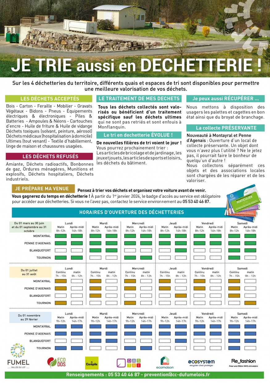 Retrouvez les déchetteries du territoire sur le lien suivant : https://www.fumelvalleedulot.com/fr/page/117/dechetteries