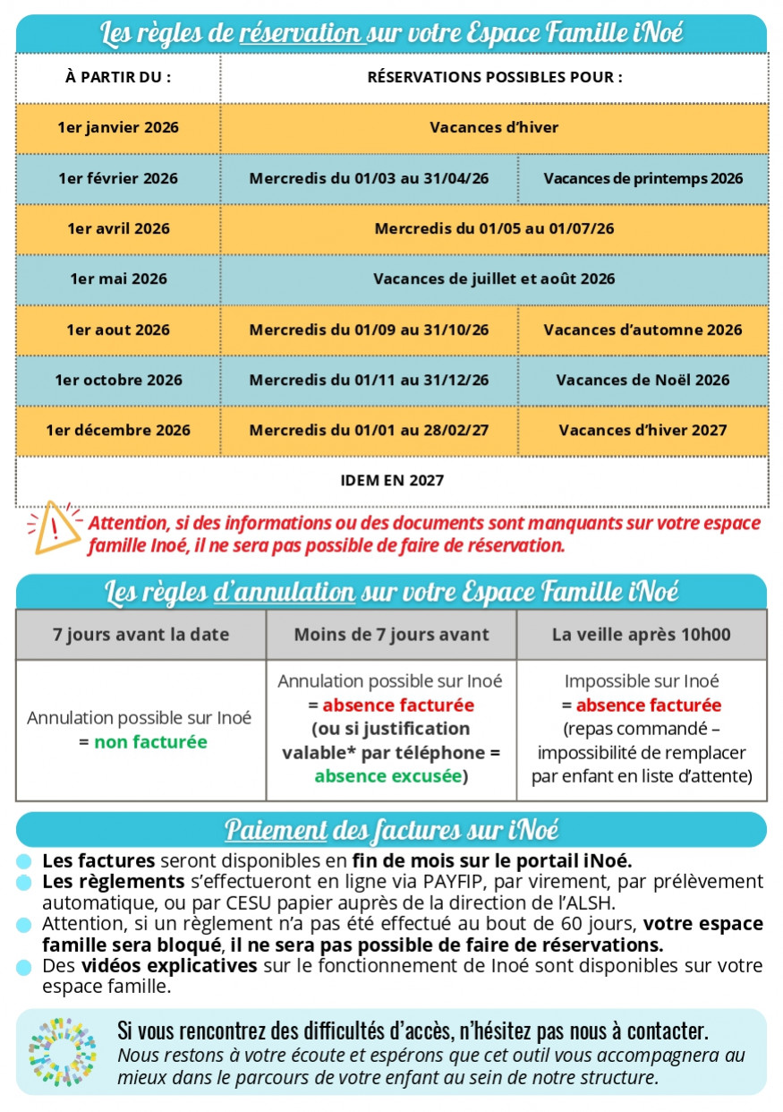 Nous vous rappelons que la réservation des journées d’accueil de votre enfant est obligatoire.